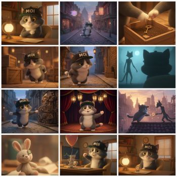 Create ONE single image: a 12-panel storyboard laid out as a 4×3 grid (4 columns × 3 rows) — a cohesive Pixar-inspired 3D animated look: high polish, soft volumetric lighting, physically plausible shaders, detailed fiber-level fur, consistent cinematic camera language. Overall image should be high resolution suitable for preview/cropping (recommended ~3840×2880 px). NO TEXT, NO CAPTIONS, NO DIALOGUE, NO SUBTITLES, NO UI OR OVERLAYS anywhere in the image...