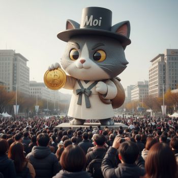 한국어 번역: 한복과 매듭 고름을 착용한 회색과 흰색 고양이 캐릭터의 전신 동상. 머리에는 "Moi"라는 글자가 적힌 검은색 높은 모자를...