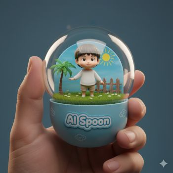 A detailed, transparent gashapon capsule diorama, held between fingers, featuring AI Spoon standing inside....